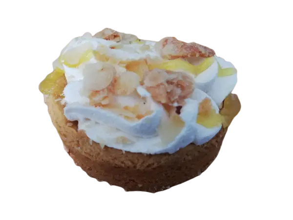 Een wienerbodem royaal opgespoten met romige crème, afgewerkt met knapperig schaafsel en een zoetzure lemonsmaak.