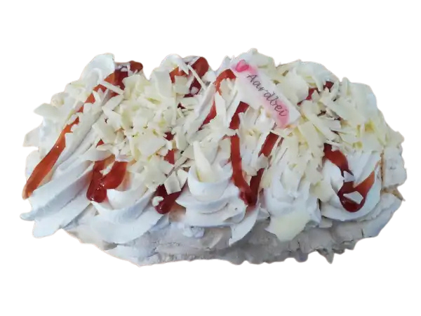 Dé slof voor schuimliefhebbers. Een basis van vers hazelnootschuim, afgewerkt met romige crème, wit chocoladeschaafsel en aardbeienjam.