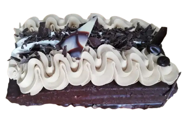 Luchtige kapsel omgeven door chocolade afgewerkt met mokka crème en chocoladeschaafsel.